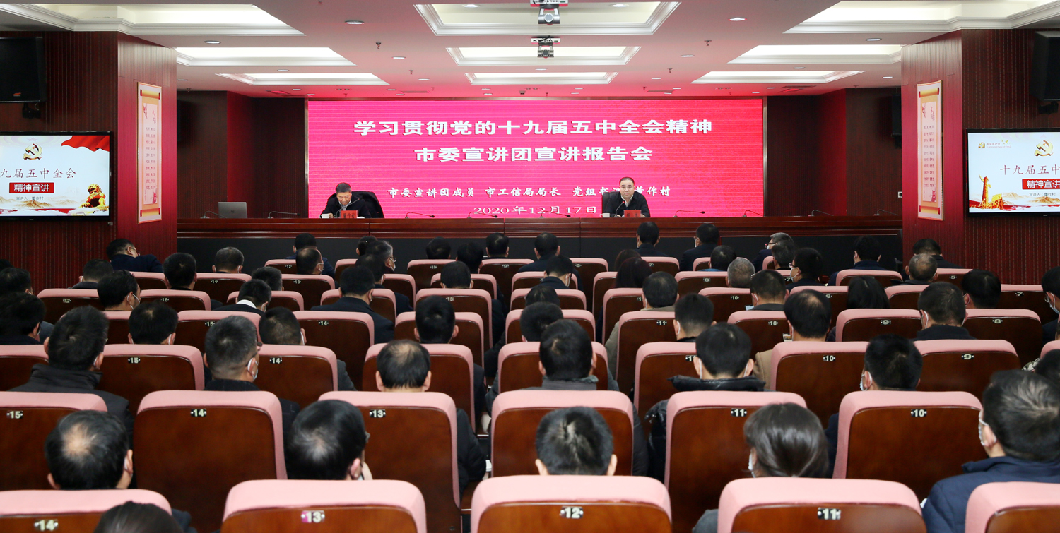 根據(jù)市委統(tǒng)一部署,12月17日,市委宣講團(tuán)來集團(tuán)開展黨的十九屆五中全會精神宣講活動。市委宣講團(tuán)成員、工信局局長、黨組書記董作村作宣講報告。集團(tuán)公司黨委書記、董事長楊龍主持宣講報告會。