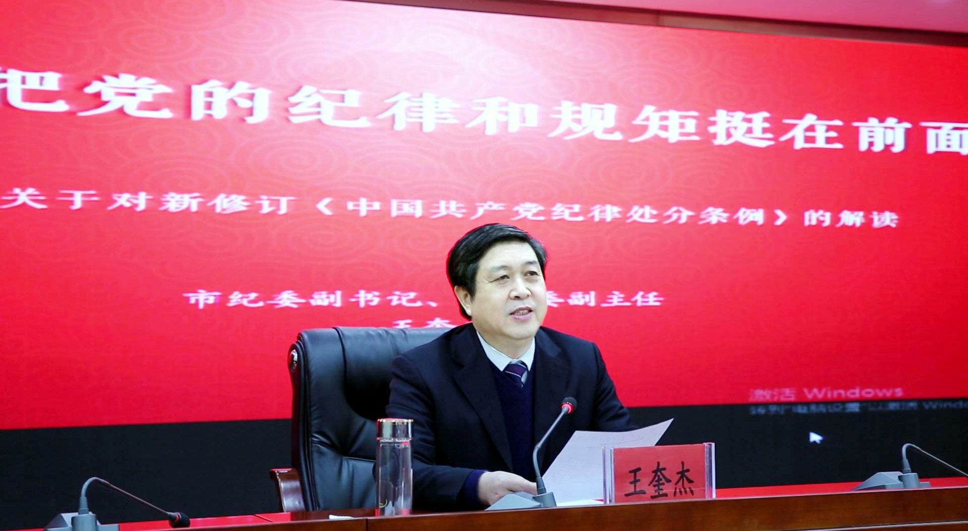 1月17日上午,集團公司舉辦學習貫徹新修訂的《中國共產(chǎn)黨紀律處分條例》專題輔導報告會。邀請市紀委副書記、市監(jiān)委副主任王奎杰對新《條例》進行輔導解讀,市國資委副主任許峰出席報告會。集團公司黨委書記、董事長楊龍主持并講話。