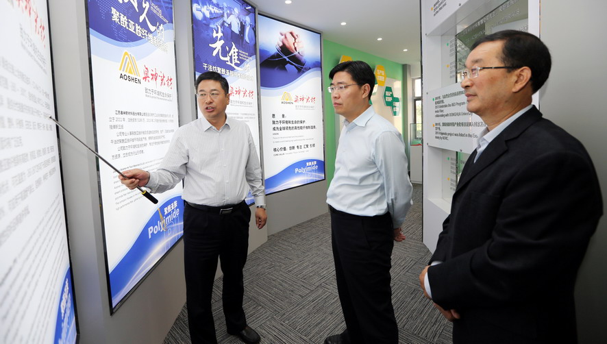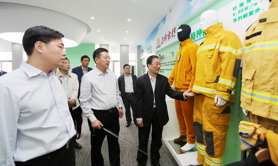 曹衛(wèi)東一行先后參觀了奧神新材料公司展廳和聚酰亞胺高性能纖維生產(chǎn)車間,并聽取了相關情況匯報,對奧神新材料公司的研發(fā)能力和高性能纖維產(chǎn)業(yè)發(fā)展成效給予了充分肯定。曹衛(wèi)東指出,奧神新材料公司成立五年來,以創(chuàng)新驅(qū)動轉(zhuǎn)型為動力,致力推進企業(yè)技術創(chuàng)新、產(chǎn)品創(chuàng)新和市場創(chuàng)新,取得了令人矚目的成績?!笆濉逼陂g,作為高性能纖維自主研發(fā)制造企業(yè)、聚酰亞胺纖維干法紡絲生產(chǎn)核心技術的掌握者,奧神新材料公司要進一步突出高、新、優(yōu)特色,切實踐行創(chuàng)新發(fā)展理念,加強自主知識產(chǎn)權(quán)保護,在聚酰亞胺纖維研發(fā)及生產(chǎn)方面著力突破新技術、提升創(chuàng)新力,推動產(chǎn)業(yè)高端化、規(guī)?;⒓刍l(fā)展,打造國內(nèi)一流的新材料產(chǎn)業(yè)基地,為推動連云港市纖維新材料產(chǎn)業(yè)發(fā)展做出新的貢獻。