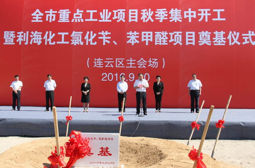 920日,我市重點(diǎn)工業(yè)項(xiàng)目秋季集中開(kāi)工(連云區(qū)主會(huì)場(chǎng))暨利海化工氯化芐、苯甲醛項(xiàng)目奠基儀式在利海公司舉行,市委書(shū)記、市人大常委會(huì)主任楊省世,市領(lǐng)導(dǎo)楊莉、董恕娟、徐家保、魯林,集團(tuán)公司董事長(zhǎng)、黨委書(shū)記楊龍、總經(jīng)理胡建明等出席開(kāi)工儀式。