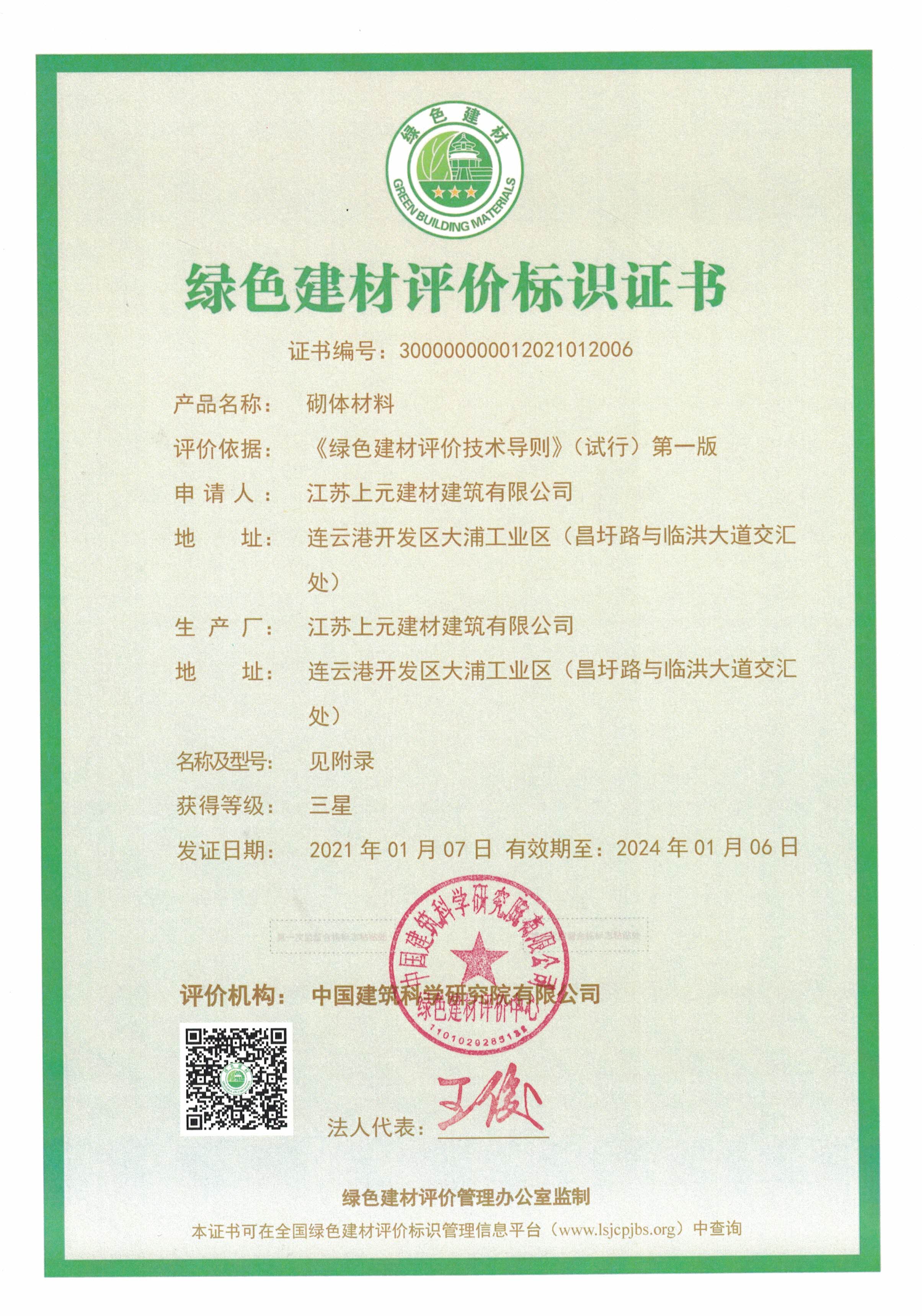 近日,房地產(chǎn)上元建材建筑公司成功獲得國家三星級綠色建材評價(jià)標(biāo)識證書,為連云港市首家獲得該項(xiàng)榮譽(yù)的蒸壓加氣混凝土板(砌塊)類企業(yè)。
