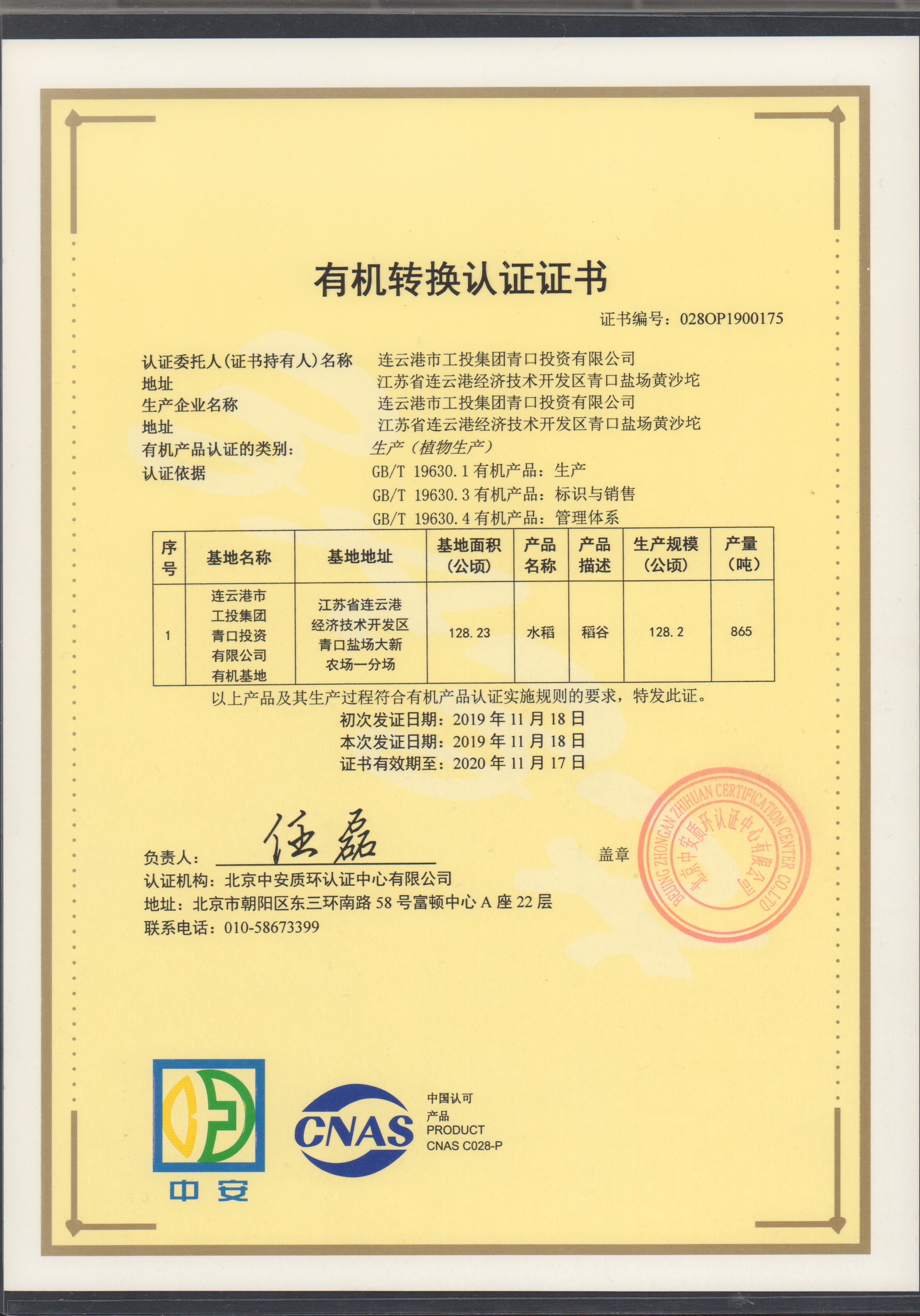 11月25日上午,青口投資公司種植的“南粳9108”有機(jī)大米經(jīng)過(guò)嚴(yán)格的檢測(cè)和審核,榮獲北京中安質(zhì)環(huán)認(rèn)證中心頒發(fā)的有機(jī)轉(zhuǎn)換認(rèn)證證書(shū)。