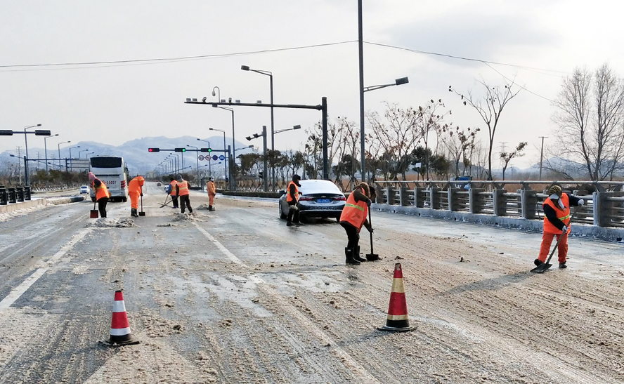 裕升、裕欣、裕祥三家養(yǎng)護(hù)公司組織綠化、保潔人員配合除雪車、裝載機(jī)等機(jī)械設(shè)備對花果山大道、黃海大道、東方大道、242省道、新光路及大浦路等主干道進(jìn)行清雪作業(yè);對程圩橋、先鋒大橋等橋面易積雪路段以及馬山路立交、新光路涵洞等“上跨下穿”路段采用撒氯化鈣的方式,加速積雪融化,并安排人員及時(shí)掃除積雪,防止路面因低溫降雪產(chǎn)生冰凍,對交通安全造成影響;對創(chuàng)智綠園廣場、火車站廣場及匝道等窗口地段采用人機(jī)結(jié)合的形式清掃積雪。盛達(dá)市政公司、瑞泰服務(wù)公司及益豐園林公司在提供鏟車、平板車、裝載機(jī)等機(jī)械車輛配合掃雪的同時(shí),積極做好后勤服務(wù),為清雪工作有序開展提供保障。截至到中午,各條主干道積雪已基本清理完畢,道路恢復(fù)暢通,保障居民出行和交通安全。