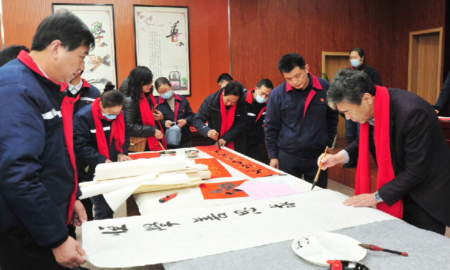 “千門萬戶曈曈日,總把新桃換舊符?!庇麓?、貼春聯(lián),是中華民族的傳統(tǒng)習(xí)俗。為了弘揚(yáng)傳統(tǒng)文化,營(yíng)造喜慶祥和的節(jié)日氛圍,2022年1月14日,氨綸公司工會(huì)開展了“迎新春,送春聯(lián)”活動(dòng)。邀請(qǐng)到省市書協(xié)書法名家現(xiàn)場(chǎng)揮毫潑墨,為職工送上新春的祝福。