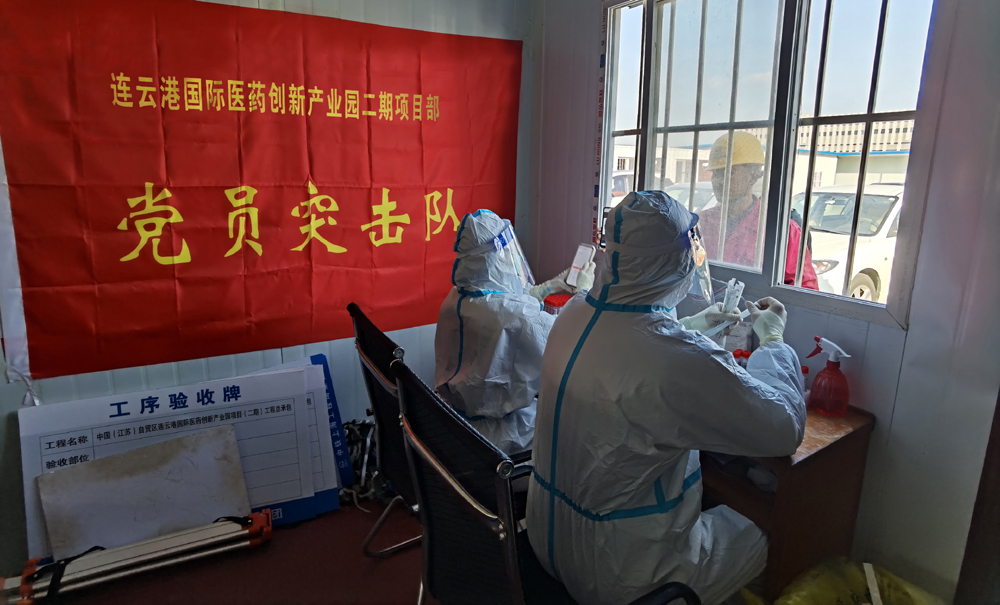 “請(qǐng)大家保持一米線,戴好口罩,有序參與核酸檢測(cè),謝謝配合!”來(lái)自市級(jí)重大項(xiàng)目連云港國(guó)際醫(yī)藥創(chuàng)新產(chǎn)業(yè)園二期項(xiàng)目黨員突擊隊(duì)的成員席時(shí)棟、陳家輝喊道。據(jù)悉,該項(xiàng)目目前按照上級(jí)相關(guān)規(guī)定,實(shí)行閉環(huán)管理,做好相關(guān)疫情防控工作。“我們項(xiàng)目部嚴(yán)格按照市、開(kāi)發(fā)區(qū)相關(guān)規(guī)定,做好閉環(huán)施工,疫情防控、項(xiàng)目建設(shè)兩手抓、兩手硬?!眮?lái)自集團(tuán)棚戶區(qū)改造裕源三期項(xiàng)目負(fù)責(zé)人青年黨員徐震說(shuō)道。
