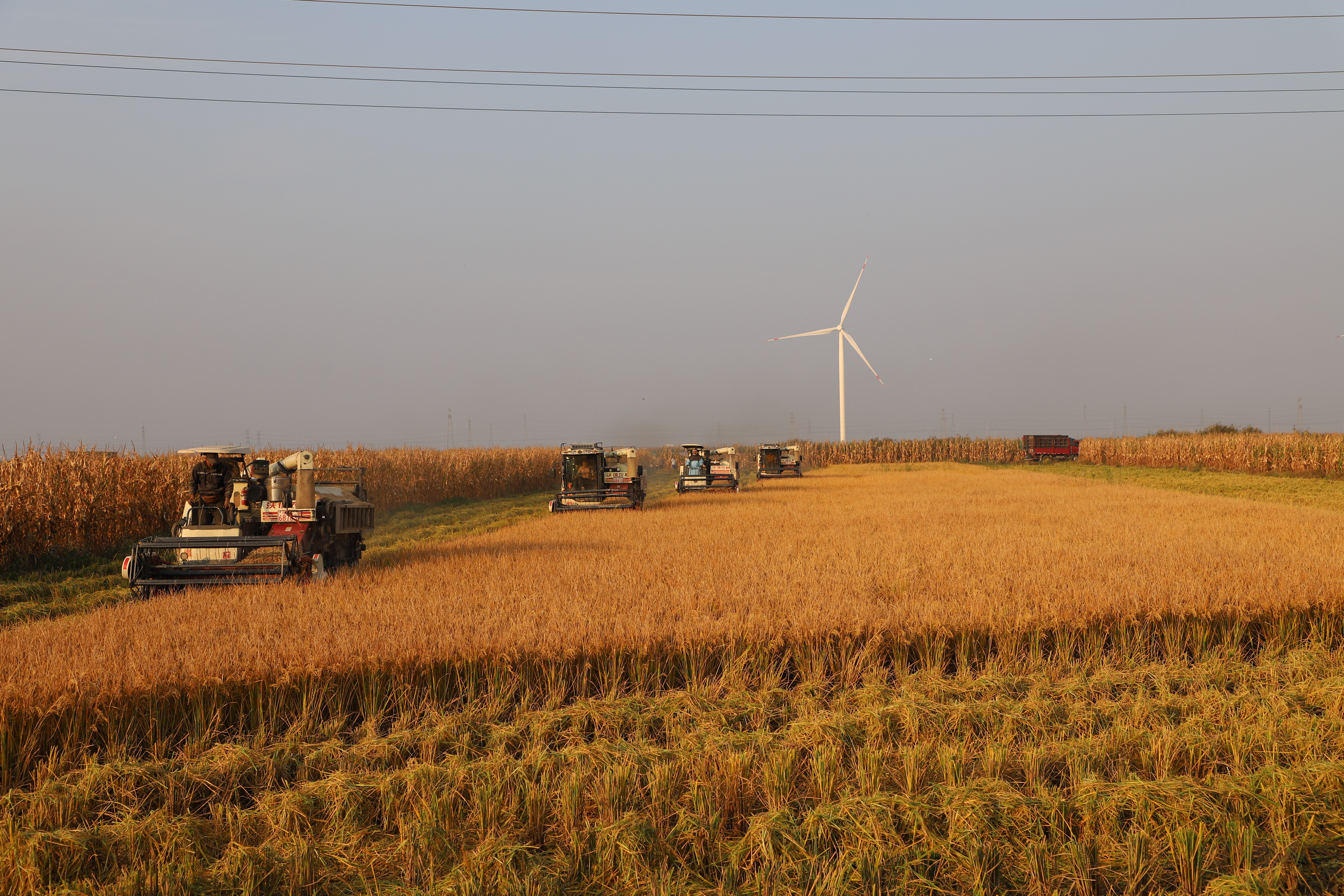 秋高氣爽,稻谷飄香。當(dāng)下,正是水稻收割的大忙季,田間稻浪翻滾,馬達(dá)轟鳴,一臺(tái)臺(tái)收割機(jī)在稻田里來回穿梭,割稻、脫穗、粉碎稻桿一氣呵成,一壟壟沉甸甸的稻谷很快便收獲歸倉,田間一派繁忙、豐收的景象。