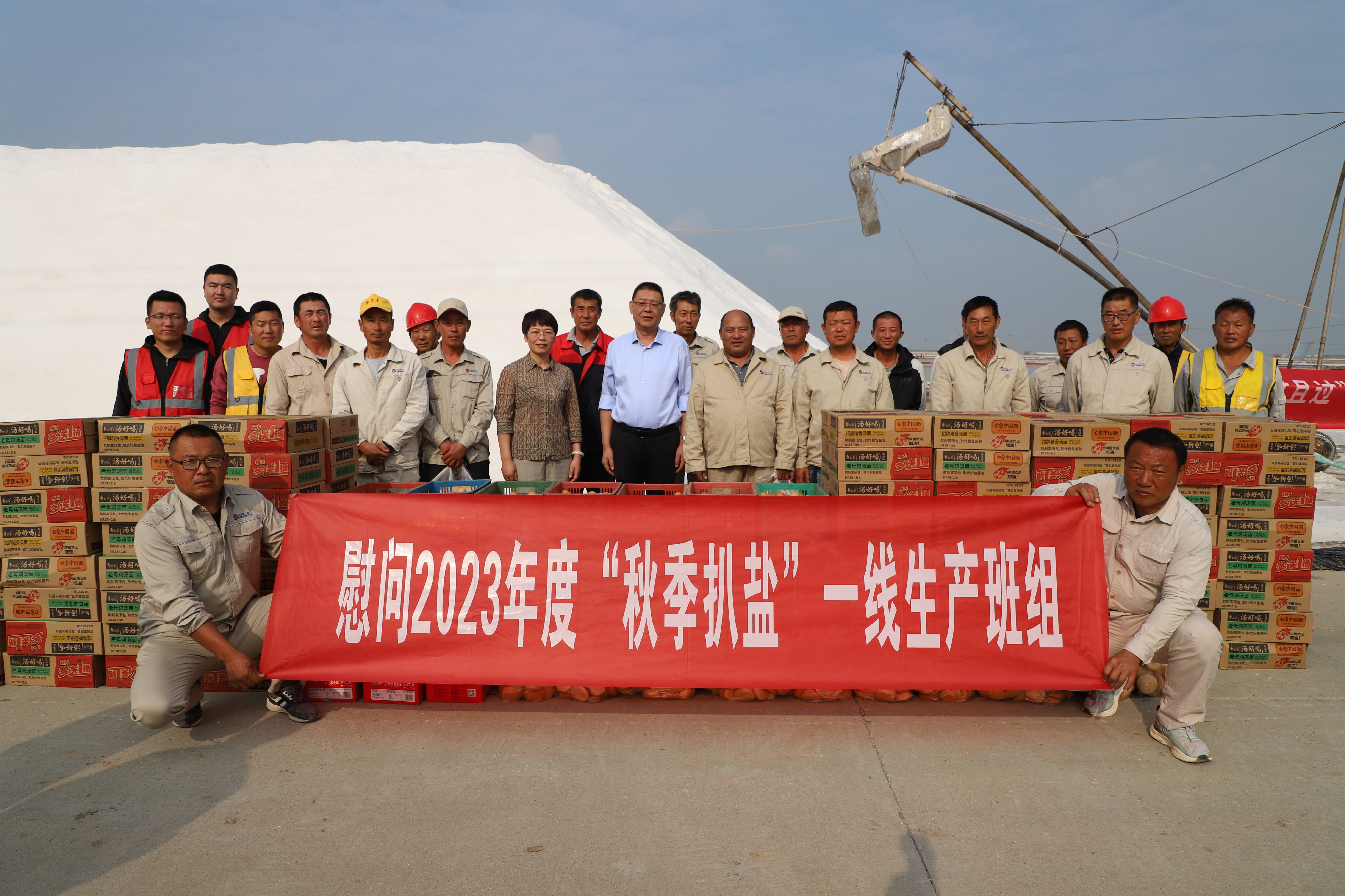 收獲的季節(jié),秋高氣爽的天氣、堆垛成廩的鹽粒、曬得黝黑的面龐,組成了鹽場(chǎng)灘頭鹽工們大干的場(chǎng)景。10月13日上午,灌西投資公司黨委書(shū)記、董事長(zhǎng)孫政權(quán)與黨委副書(shū)記、工會(huì)主席王宏;總經(jīng)理吳衛(wèi)平與常務(wù)副總經(jīng)理徐一林分別帶隊(duì)深入日曬制鹽秋收鹽現(xiàn)場(chǎng),看望慰問(wèn)奮戰(zhàn)在一線(xiàn)的扒鹽員工,鼓勵(lì)他們?cè)谧龊米陨矸雷o(hù)的同時(shí)再接再厲,為今年的原鹽豐收再立新功。