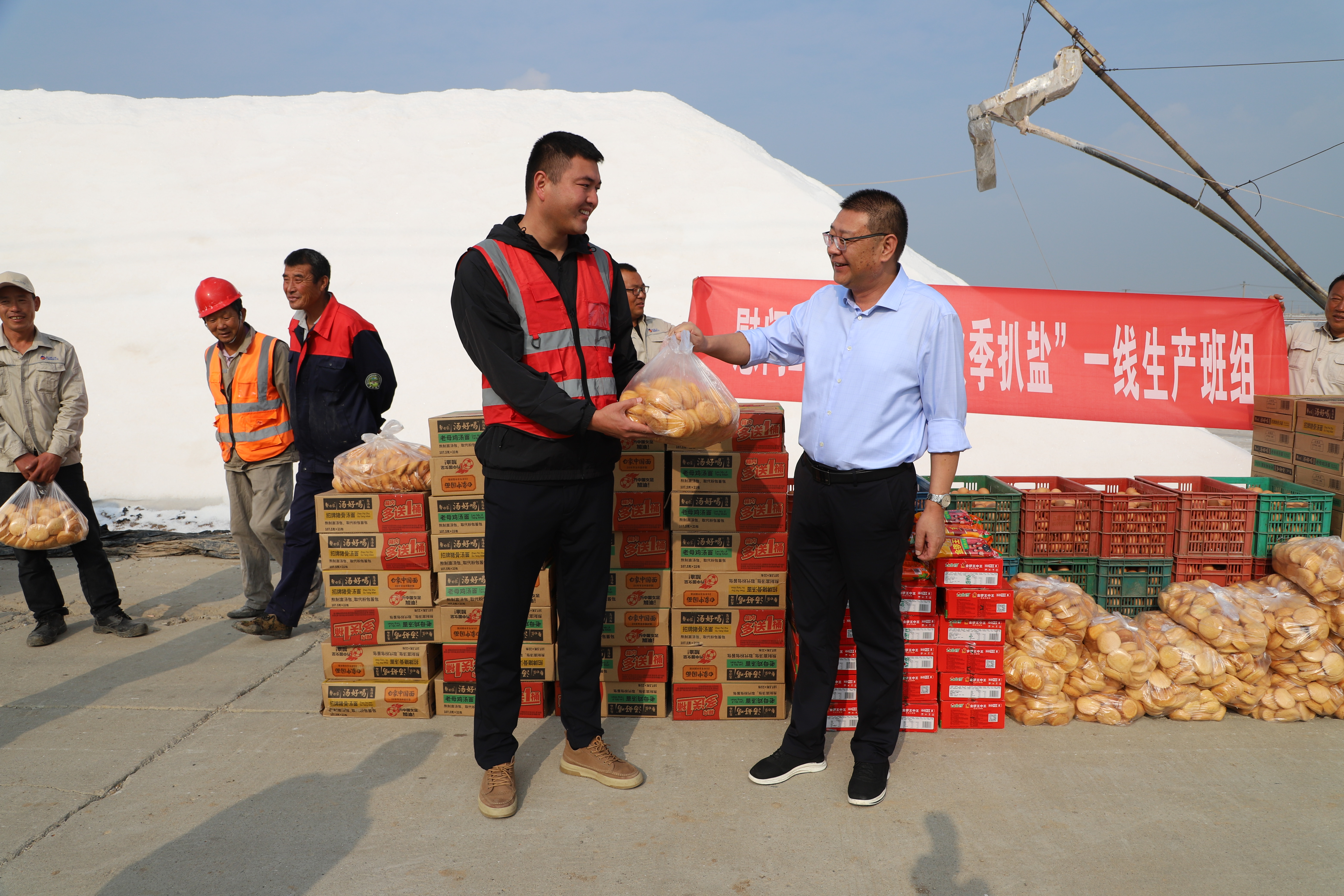 “你們辛苦了,我代表公司來(lái)看望大家?!痹谛潞游灏啵瑢O政權(quán)與扒鹽現(xiàn)場(chǎng)職工握手問(wèn)好,感謝他們?yōu)槿諘裰汽}公司的原鹽生產(chǎn)所付出的辛勤努力,叮囑他們要落實(shí)落細(xì)扒鹽安全生產(chǎn)措施,并送上雞蛋、方便面、火腿腸、雞蛋糕等物品。