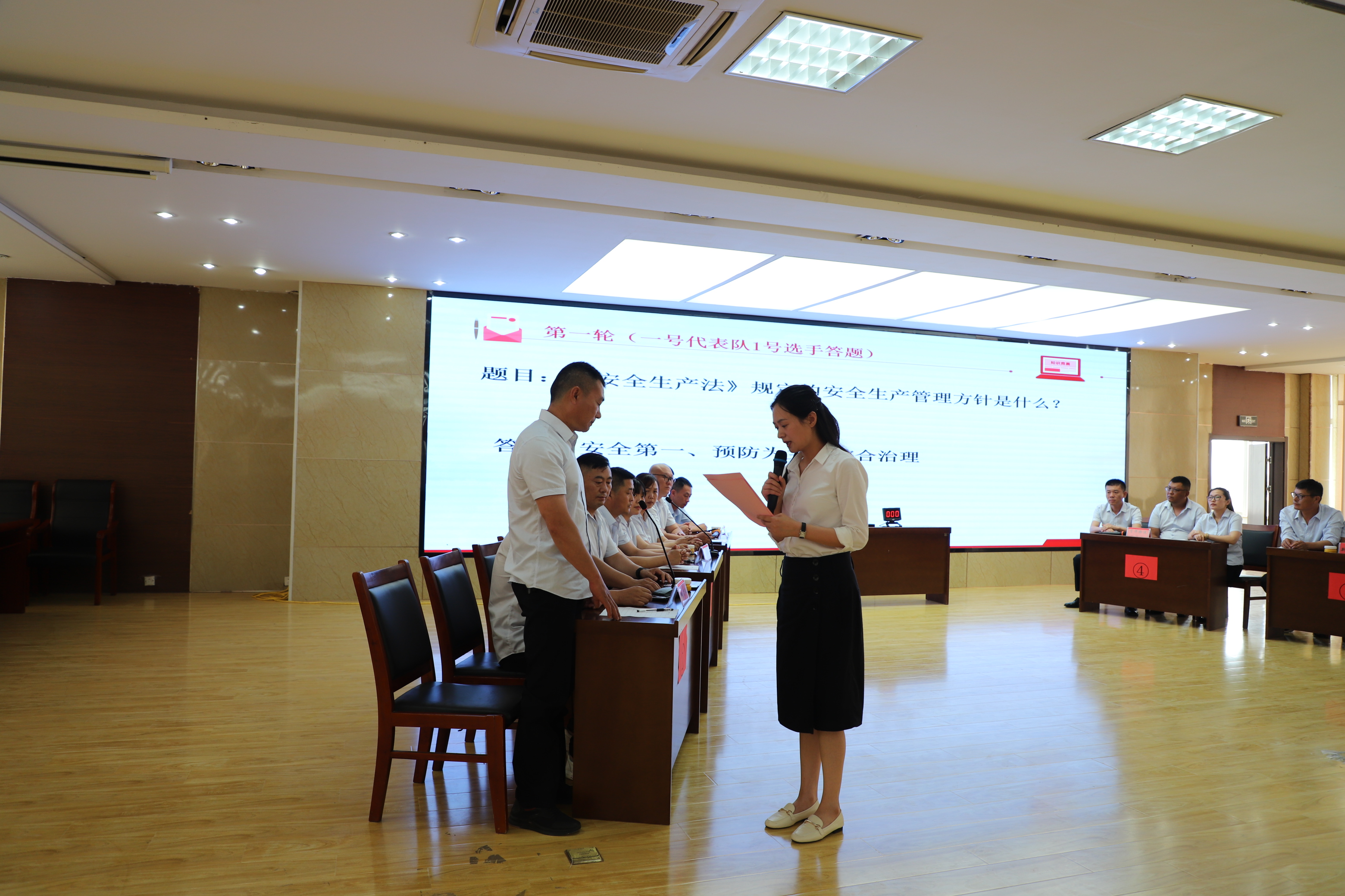 來自各單位的6支代表隊(duì)參加比賽,比賽在必答題、“看圖找錯(cuò)”、風(fēng)險(xiǎn)題、搶答等五個(gè)環(huán)節(jié)中展開角逐,活動(dòng)現(xiàn)場(chǎng),各代表隊(duì)選手自信滿滿、胸有成竹、干脆利落地進(jìn)行答題,在一次又一次“手速”與“腦力”中比拼,比分你追我趕,不相上下。特別是在風(fēng)險(xiǎn)題環(huán)節(jié),由于可供各代表隊(duì)選擇的答題難易程度、風(fēng)險(xiǎn)程度和與之相應(yīng)的分值懸殊明顯,各代表隊(duì)更是來了一場(chǎng)戰(zhàn)術(shù)與策略的較量,整場(chǎng)比賽氣氛熱烈、高潮迭起、精彩紛呈,臺(tái)下觀眾不時(shí)爆發(fā)出熱烈掌聲。