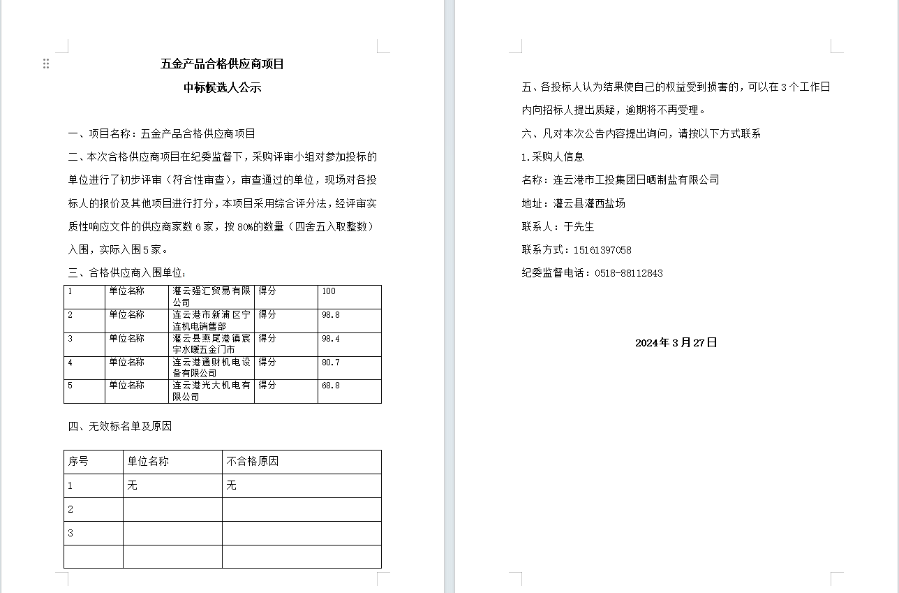 五金產(chǎn)品合格供應(yīng)商項目中標(biāo)候選人公示