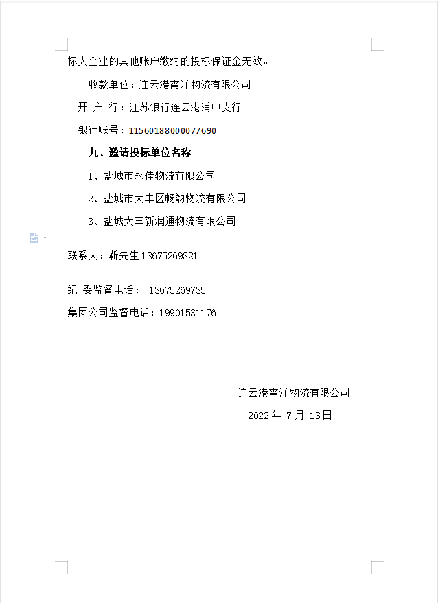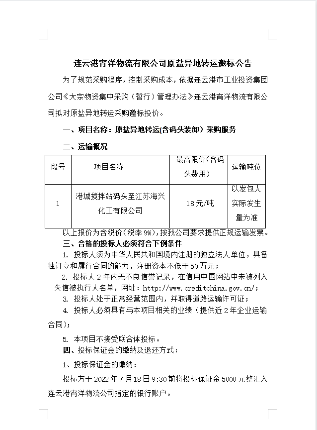 連云港宵洋物流有限公司原鹽異地轉(zhuǎn)運邀標(biāo)公告