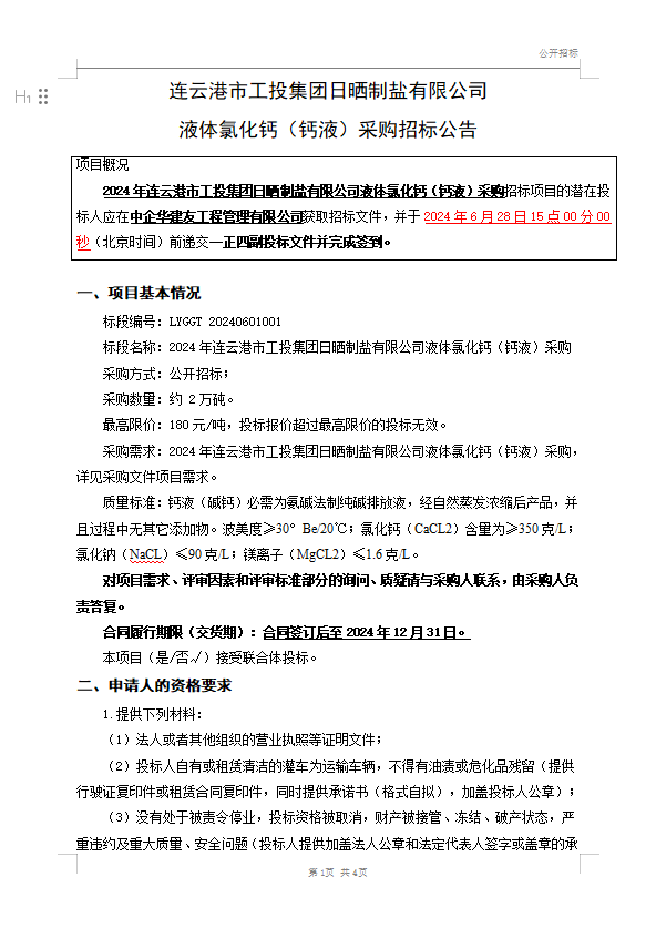 日曬制鹽公司 液體氯化鈣(鈣液)采購(gòu)招標(biāo)公告