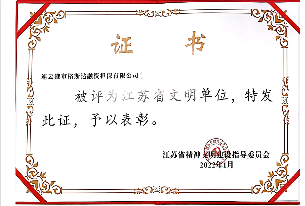 1月,格斯達擔保公司被省精神文明建設(shè)指導(dǎo)委員會評為“江蘇省文明單位”稱號。