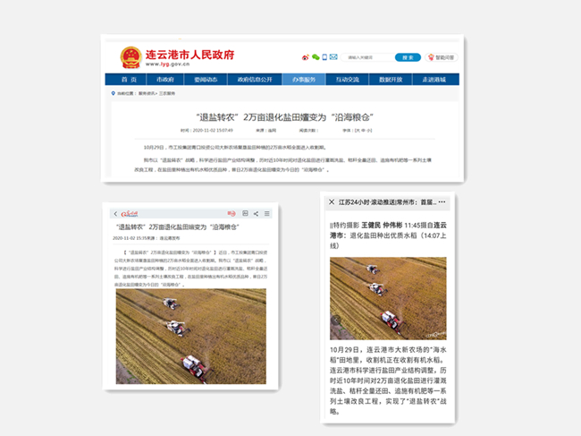 今年收割期間,人民網(wǎng)、光明網(wǎng)、江蘇24小時(shí)、連云港市人民政府網(wǎng)、連云港日?qǐng)?bào)連續(xù)報(bào)道了我公司鹽堿地水稻豐收、秸稈綜合利用等工作舉措。我公司在現(xiàn)代農(nóng)業(yè)發(fā)展和生態(tài)文明建設(shè)中取得的成就受到了媒體廣泛關(guān)注。(青宣)