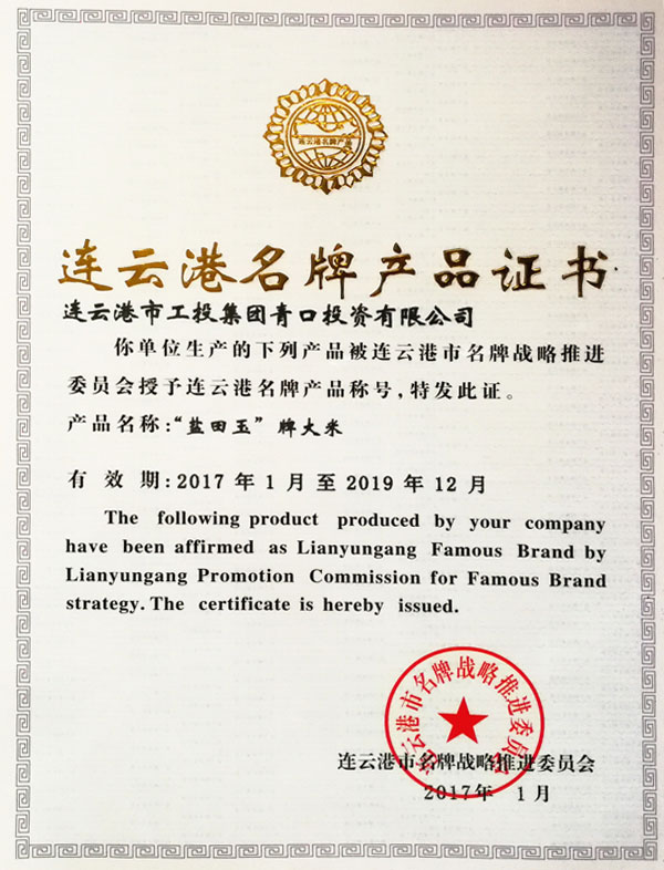 ? ? ? ? 近日,我公司“鹽田玉”品牌大米經(jīng)過連云港市名牌戰(zhàn)略推進(jìn)委員會審議,被授予2017-2019年度“連云港名牌”稱號。這是米業(yè)營銷中心對“鹽田玉”品牌創(chuàng)建的又一重大突破,也為下一步大米營銷工作打下堅實的品牌基礎(chǔ)。(王踴)