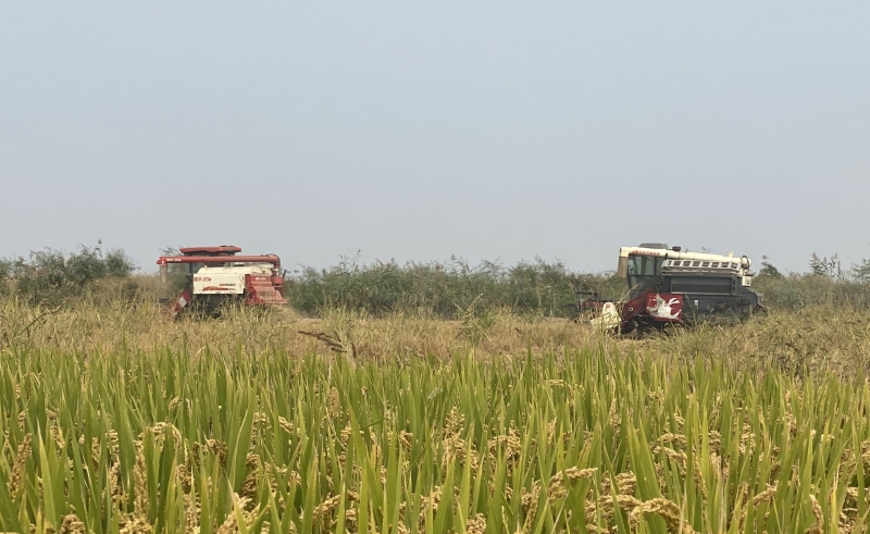 ? ? ? ?10月13日,大新農場50余畝稻花香水稻迎來成熟期,開鐮收割。在金色的稻田里,稻谷隨著秋風翻起波浪,空氣中裹挾著稻米的清香。轟隆隆的收割機來回穿梭在稻田之中“作畫”,眼前呈現(xiàn)出一派秋收的忙碌景象。(王璐)