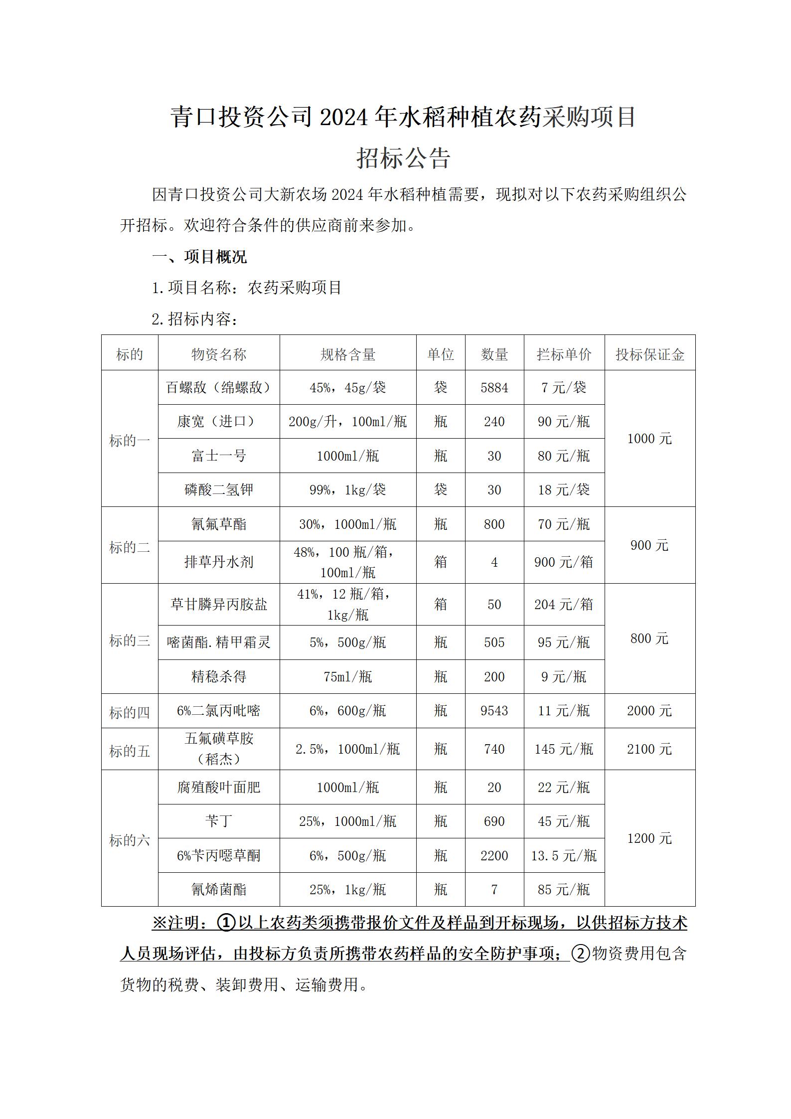 中標(biāo)者信息于連云港市工投集團(tuán)青口投資有限公司網(wǎng)站公示3日,公示期滿簽訂相應(yīng)的物資采購(gòu)合同《農(nóng)藥采購(gòu)協(xié)議》。拒絕簽訂協(xié)議的,視為自動(dòng)放棄,做廢標(biāo)處理。
