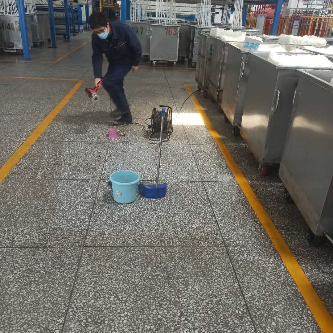 為解決生產(chǎn)車間地表面磨損嚴重及地表面黑化等問題,418日中午,生產(chǎn)車間甲班大班長黨曉峰使用手持式打磨機,對生產(chǎn)車間后紡集束空地小塊區(qū)域,進行了打磨加石板蠟拋光實驗。若實驗效果良好,可進行全車間使用,改善地面油漬黑化現(xiàn)狀,美化生產(chǎn)環(huán)境。