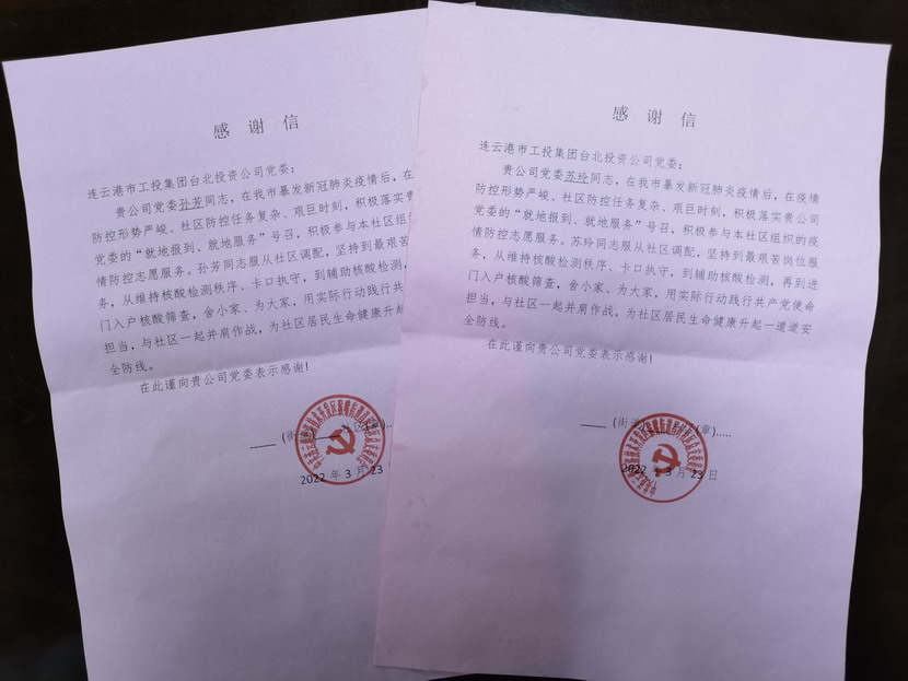 “臺(tái)北投資公司的黨員同志們視疫情防控為己任,服從調(diào)度安排,站好每一班崗,不僅認(rèn)真履行防控職責(zé),又創(chuàng)新開展疫情防控教育宣傳、便民服務(wù)等多項(xiàng)活動(dòng),成為我們社區(qū)防疫攻堅(jiān)的主力軍?!?/span>3月25日,收到開發(fā)區(qū)猴嘴街道昌圩社區(qū)送來(lái)的一份特殊的“禮物”— 一封疫情防控感謝信,感謝臺(tái)北投資公司黨員蘇玲、孫芳等同志在新冠肺炎疫情防控的關(guān)鍵階段挺身而出、伸出援手,參與協(xié)助社區(qū)的疫情防控工作。