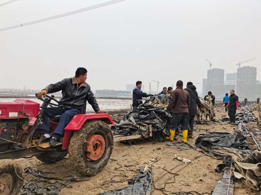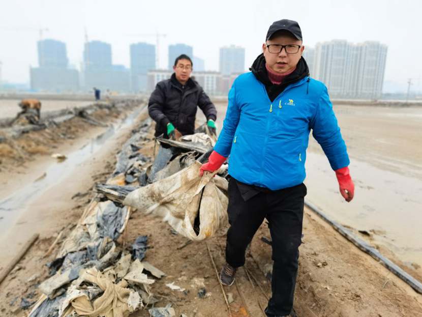 1月10日下午,第一批馳援隊(duì)伍——翔立分公司黨員突擊隊(duì)到達(dá)先鋒班組,結(jié)合海州灣公司黨員突擊隊(duì)共30余名隊(duì)員,穿戴好工作服、水鞋,兩人一組,三人一隊(duì),雙肩挑,三人抬,緊張有序地清理生產(chǎn)現(xiàn)場拆除下來的廢棄的塑布、鋼絲等雜物。