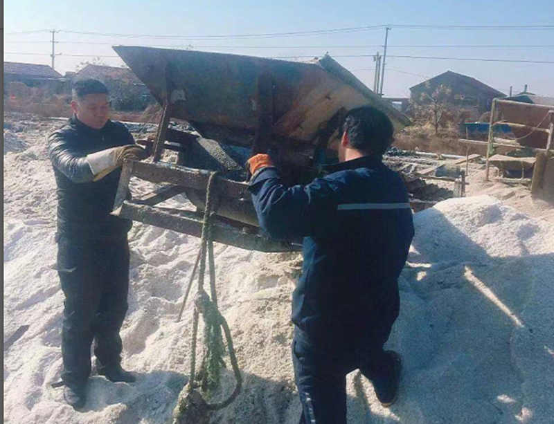 在海洲灣公司的海濱三組原鹽集運(yùn)現(xiàn)場,過河原鹽皮帶機(jī)滾籠上的鋼筋因機(jī)械疲勞斷裂造成無法運(yùn)轉(zhuǎn)。為了不影響原鹽集運(yùn),接到通知后,機(jī)械班維修人員冒著刺骨嚴(yán)寒迅速攜帶電焊機(jī)等維修工具趕到現(xiàn)場。露天下,檢查拆卸、焊接加固、安裝調(diào)試一氣呵成,很快機(jī)械又重新運(yùn)轉(zhuǎn)起來。