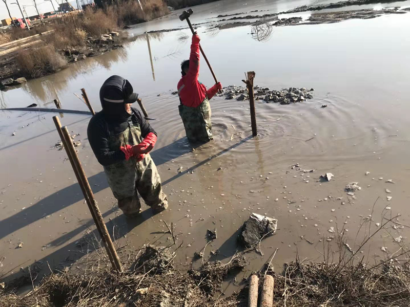 管道巡查發(fā)現(xiàn)通往堿廠的鈣液輸送管道因天氣影響爆裂損壞在送水道泥水中,搶修難度陡然增大。在困難前,我們干事豪情直面挑戰(zhàn)、創(chuàng)業(yè)激情燃燒嚴(yán)寒,穿上臃腫的防水皮衩深入到齊腰深的冰水中,卷起袖子雙手在水下摸索著對接管道,擰緊哈弗節(jié)上的每一根螺絲,接下來的打樁捆綁固定一切皆是那么的嫻熟。什么寒風(fēng)侵肌、冰澈透骨全然阻擋不住我們“鐵軍”干事創(chuàng)業(yè)的激情,鏗鏘有力的大錘不斷打下新一年的希望。