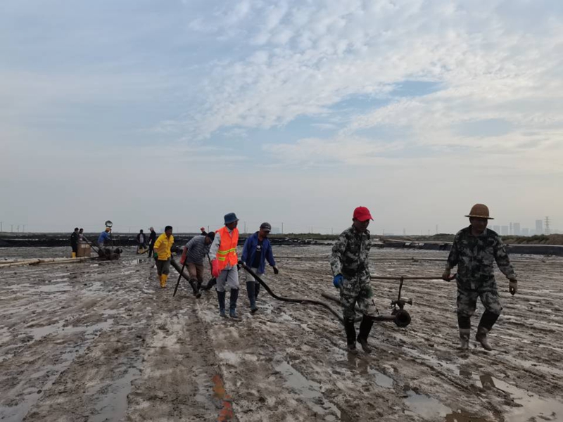 秋鹽開扒以來,海州灣公司上下所有干群,主動(dòng)放棄節(jié)假日,晝夜奮戰(zhàn)在鹽池里。人工扒鹽三班倒,做到人停機(jī)不停;跟班人員24小時(shí)無縫銜接,確保時(shí)刻在扒鹽現(xiàn)場做好安全監(jiān)管工作。目前,隨著堿廠關(guān)停的步伐加快,原鹽搶收工作進(jìn)入到了決戰(zhàn)階段,在公司黨委的大力支持下,兄弟單位及機(jī)關(guān)各職能部門的火速馳援下,海州灣公司迅速啟動(dòng)第二臺(tái)機(jī)械扒鹽管道,與人工扒鹽同步進(jìn)行。公司領(lǐng)導(dǎo)與廣大職工想在一起、干在一起,上下齊心、爭分奪秒,擼起袖子、甩開膀子,在鹽池間盡情地?fù)]灑著汗水,確保勞動(dòng)成果顆粒歸倉,誓奪原鹽收官戰(zhàn)的勝利。