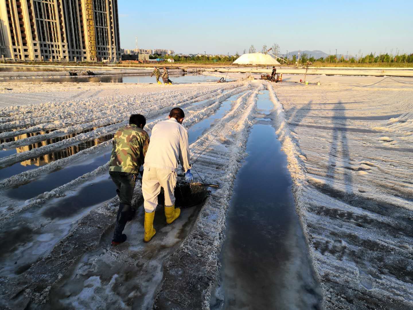 工區(qū)加大結(jié)晶工藝調(diào)整力度,塑苫布及蓋及收,不放過1毫米蒸發(fā)量,真正做到“云彩縫里奪鹽斤”。對走完鹽的廩基進行泡制,充分挖掘制鹵潛力,抓好窮制鹵。嚴把結(jié)晶灌池關(guān)、鹵水進池關(guān)、塑池管理關(guān)、結(jié)晶環(huán)境關(guān),搶天時、抓制鹵、促工藝、結(jié)合實際加深水工,強制飽和鹵水。針對14、15班已征用灘地,在機械扒鹽后又用人工進行二次扒鹽,將塑池內(nèi)的鹽斤徹底收回,真正做到顆粒歸倉,為完成原鹽生產(chǎn)計劃盡心、盡力。