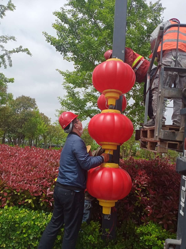 施工現(xiàn)場(chǎng),大家配合默契利用小型叉車進(jìn)行輔助拆除作業(yè),五分鐘不用一個(gè)燈籠就拆除完成。這邊完成拆除部分,那邊負(fù)責(zé)還原以及運(yùn)送回收。由于燈籠的不可收攏性,同時(shí)為避免造成二次污染,對(duì)于拆下來的燈籠及時(shí)進(jìn)行運(yùn)送和回收保存,確保第二年要安裝的時(shí)候重復(fù)利用。