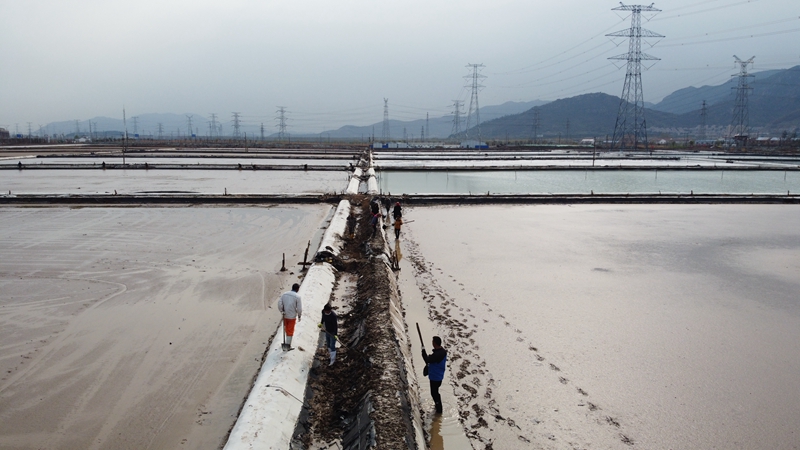 此時正是春曬制鹽的“黃金期”,海州灣公司獲知情況后,主動帶領(lǐng)全體員工組成“突擊隊(duì)”為兄弟單位“減負(fù)”,在大家共同努力下長約1200米的池堰一上午修整完畢,為下一步的池內(nèi)壓實(shí)及早日灌池贏得了寶貴的時間。