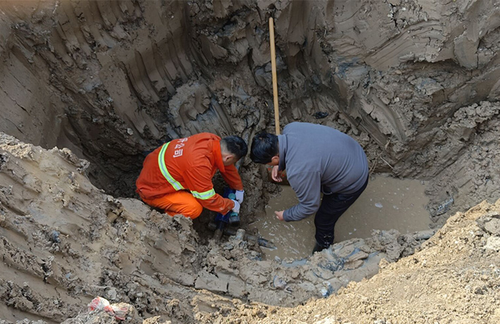 11時,已查明管道漏點處系PE63管道斷裂,至于管道斷裂的原因,判斷是地面沉降使管道落差錯位所致。搶修人員站在2米多深的泥坑里,不怕臟和累,徒手加緊管道搶修。經(jīng)2個多小時緊張有序搶修,成功將斷裂的水管修好。于當(dāng)日下午16時30分恢復(fù)供水,有力保證了轄區(qū)春季綠化澆灌工作正常開展。(王宜全、楊維軍)