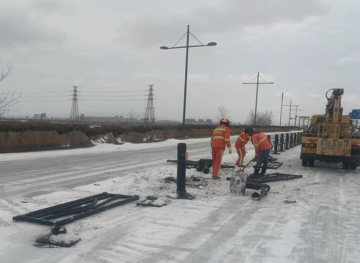 近兩日,因雨雪天氣,道路結(jié)冰濕滑,車輛行駛過程中發(fā)生意外,造成港前大道、海濱大道、228國(guó)道等地段發(fā)生多起道路護(hù)欄等設(shè)施損壞情況。收到信息后,市政分公司道路養(yǎng)護(hù)人員迅速反應(yīng),在班長(zhǎng)孫寬成帶領(lǐng)下,隊(duì)員們頂風(fēng)冒雪第一時(shí)間趕赴現(xiàn)場(chǎng)。