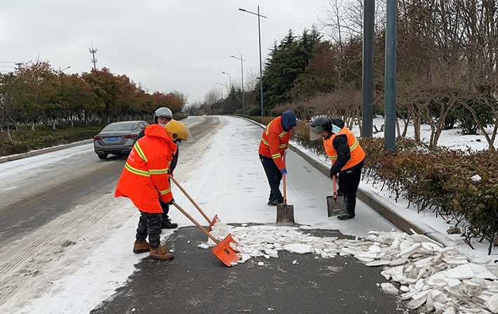 雪花紛飛,寒風(fēng)凜冽,板橋工業(yè)園區(qū)內(nèi),除雪車(chē)、雪輥車(chē)等機(jī)械設(shè)備齊上陣,采取機(jī)械化與人工除雪相結(jié)合的方式,雪鍬、掃帚齊上陣,大家你鏟我除、干勁十足,以最快的速度清除板橋園區(qū)云港路、祥和路、瑞和路等交叉路口、重要地段冰凍積雪。