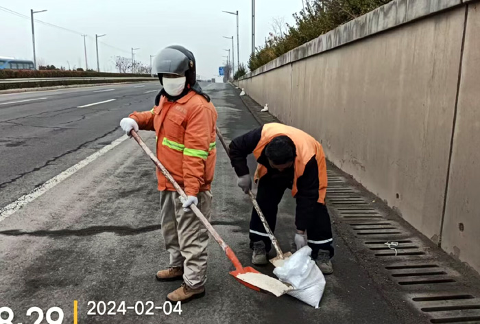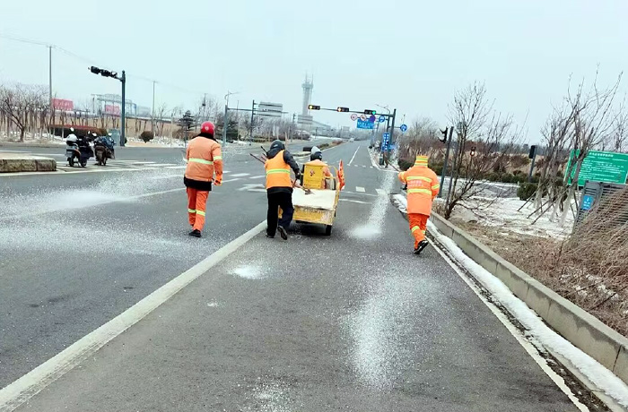 該分公司黨員突擊隊(duì)兵分3路,分別來到徐圩大道、港前大道、海濱大道核心路段。生產(chǎn)骨干沈萬軍、李傳武、張樹華等同志他們相互配合,手拿鐵锨簡(jiǎn)單有效的進(jìn)行撒放融雪劑60余噸。發(fā)現(xiàn)道路低洼結(jié)冰處及車輛轉(zhuǎn)彎口,他們立即下車?yán)醚╃P,有來有回的將冰凍鏟除,消除路面一切安全隱患。