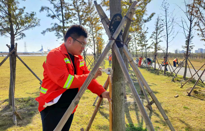 本次行動著重對張圩河公園喬木進行涂白,該區(qū)域綠化班組加班加點,利用天氣晴朗的有利時機有序推進工作進程。此次涂白采用植保涂白劑,對樹木及周圍環(huán)境無傷害無污染,在抑制寄生樹干上的真菌、細菌,做到預防腐爛病,殺死樹皮內(nèi)越冬蟲卵及蛀干害蟲,減少越冬蟲源的同時,還能反射部分陽光,避免因晝夜溫差過大而造成的樹干凍裂。按照相關要求,從配比到攪拌嚴格按照要求進行,為達到同一標準,綠化衛(wèi)士采用“立桿涂白法”,首先安排專人進行劃線,將行道樹涂白高度統(tǒng)一控制在1.2米,使區(qū)域內(nèi)涂白高度保持一致,確保樹木涂白效果與植物整體美觀。